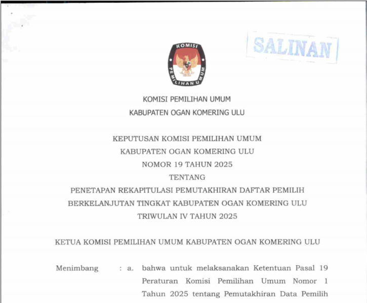 PENETAPAN REKAPITULASI PEMUTAKHIRAN DAFTAR PEMILIH BERKELANJUTAN TINGKAT KABUPATEN OGAN KOMERING ULU TRIWULAN IV TAHUN 2025