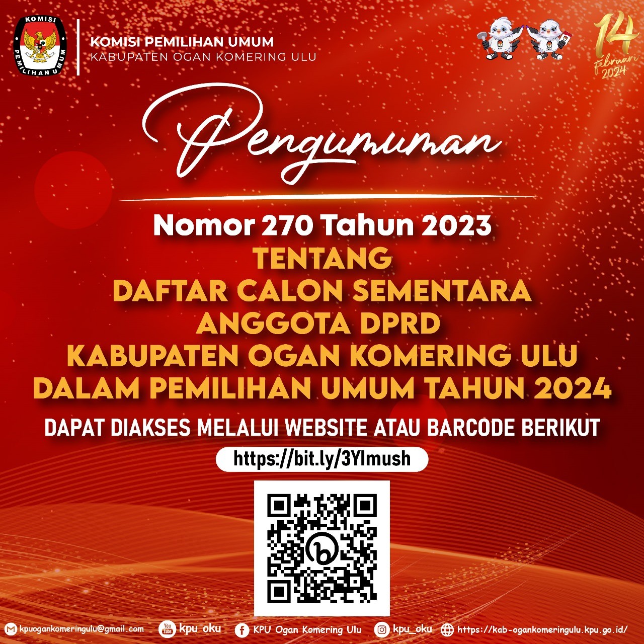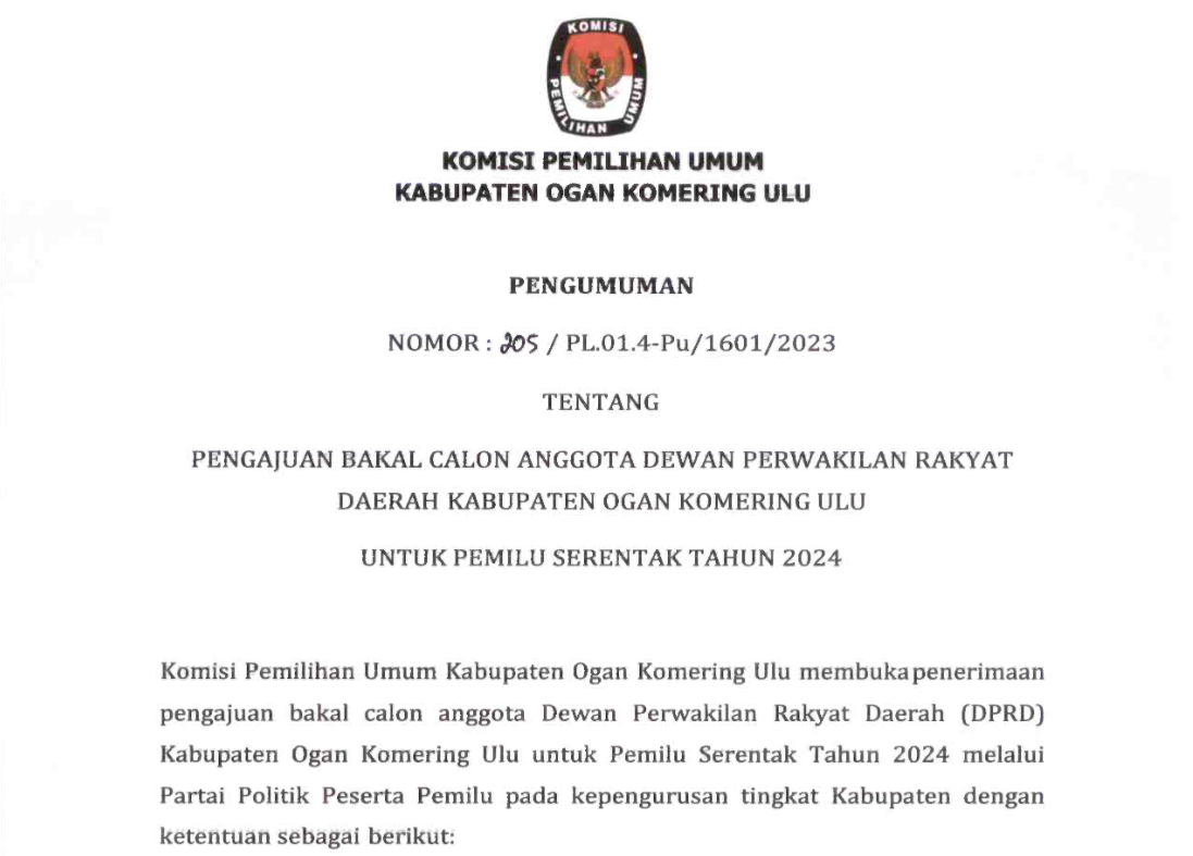 Komisi Pemilihan Umum (KPU) Kabupaten Ogan Komering Ulu membuka penerimaan pengajuan bakal calon anggota Dewan Perwakilan Rakyat Daerah (DPRD) Kabupaten Ogan Komering Ulu untuk Pemilu Serentak Tahun 2024 melalui Partai Politik Peserta Pemilu pada kepengurusan tingkat Kabupaten.